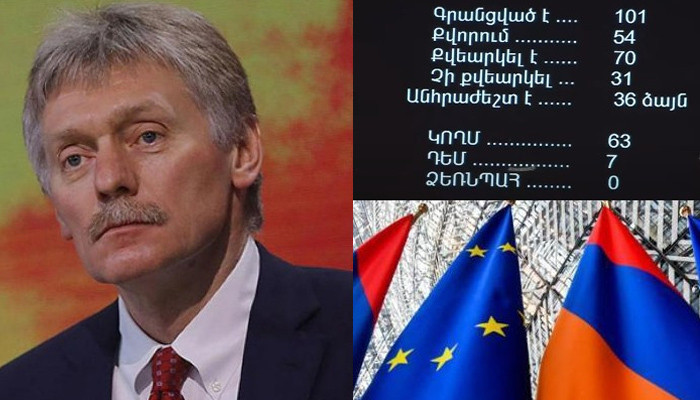 ՌԴ նախագահի մամուլի քարտուղար Դմիտրի Պեսկովն անդրադարձել է ՀՀ ԱԺ-ի կողմից առաջին ընթերցմամբ ընդունված ԵՄ-ին ՀՀ անդամակցության մասին նախագծին` ասելով, որ դա Երևանի սուվերեն իրավունքն է: «Հայաստանում կան քաղաքական որոշ ուժեր, որոնք, հավանաբար հստակ պատկերացում չունենալով, թե արդյոք Եվրոմիությունը շահագրգռված է դրանում, կարծում են, թե դեպի ԵՄ կողմնորոշումը ՀՀ-ին լրացուցիչ դիվիդենտներ է բերելու»,- նշել է Պեսկովը՝ հավելելով, որ Հայաստանն օգուտներ է ստանում ԵԱՏՄ-ին անդամակցությունից: