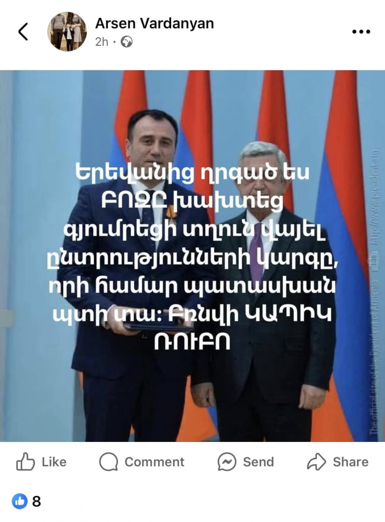 Գյումրու ՏԻՄ ընտրություններին մասնակցության հայտ ներկայացրած հանրային գործիչ Ռուբեն Մխիթարյանի դեմ իշխող ուժի անդամներն ու համախոհները սանձազերծել են մեկ կենտրոնից կառավարվող համացանցային արշավ։ Արշավի մասնակիցները, որոնց թվում են հանրային ծառայողներ, սոցցանցերի իրենց էջերում հրապարակում են հայհոյանք պարունակող նույնաբովանդակ տեքստ։