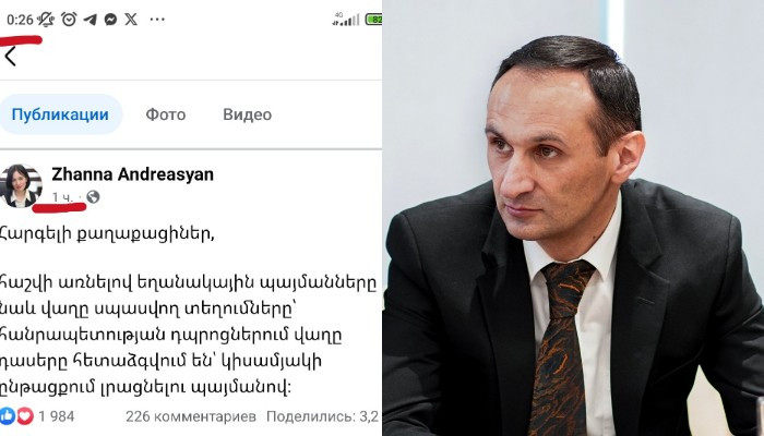 ԱԺ նախկին պատգամավոր Արմեն Եղիազարյանի ֆեյսբուքյան գրառումը. «Գիշերը ժամը 23:00-ին ԿԳՄՍ նախարարը որոշեց, որ առավոտյան երեխաները դպրոց չեն գնալու և ֆեյսբուքով տեղեկացրեց հանրությանը։