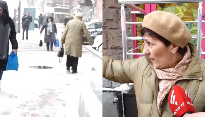 «Մայթերը մաքրած չեն, քայլել չեմ կարողանում, որ հիմա ընկնեմ, կոտրվածք ստանամ, ովա՞ ինձ պահելու, թոշակառու կին եմ։ Չեմ կարողանում ոչ խանութ գնալ, ոչ էլ մի տեղ։ Կարողա երկու քայլ անեմ, սղամ ընկնեմ»,- «ֆակտոր»-ի հետ զրույցում ասում է թոշակառու կինը՝ դժգոհելով ձնամաքրման աշխատանքներից։